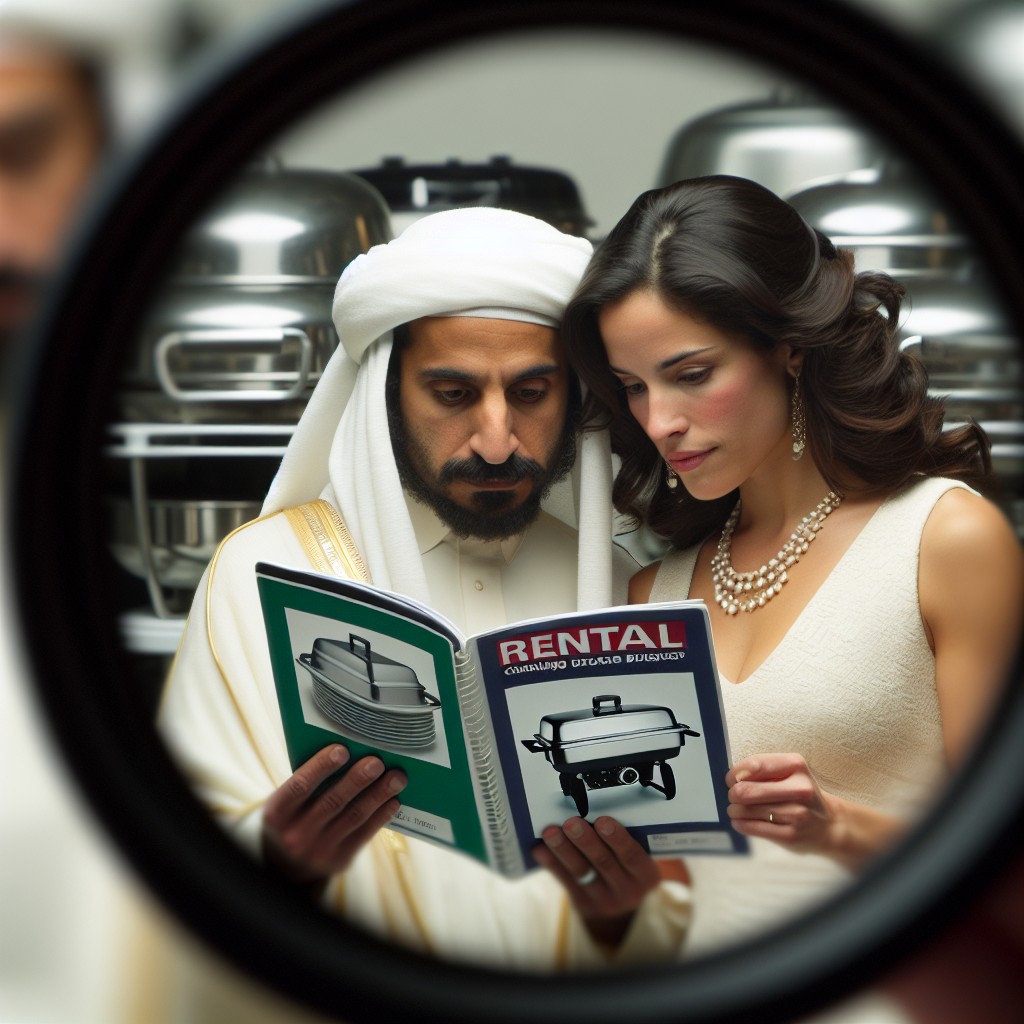 זוג מסתכל על קטלוג השכרת ציוד לחינה.